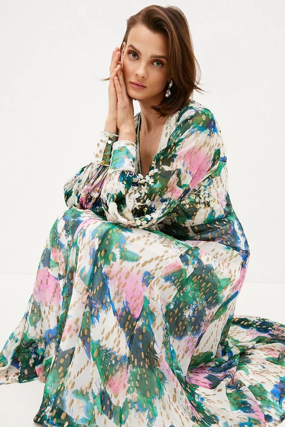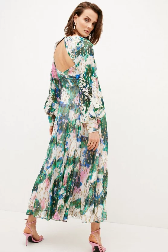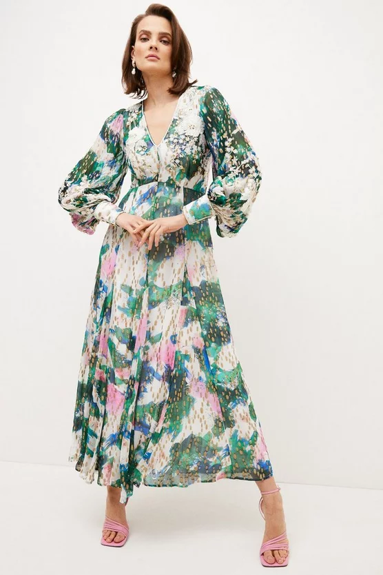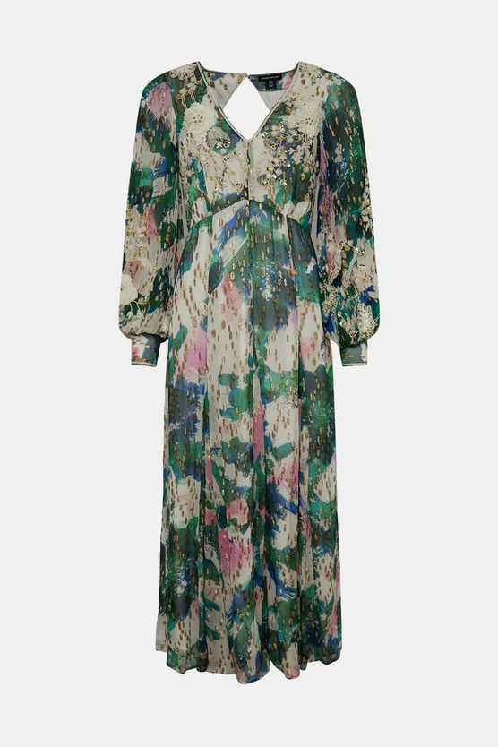 Defined by its painterly print and dramatic puffed sleeves, this woven maxi dress would fit right in at balmy summer parties. It features a V-neck bodice, flowing maxi skirt and directional open back to bare a hint of sun-kissed skin. Flecked with metallic applique trims, it glints alluringly under the summer sunlight.