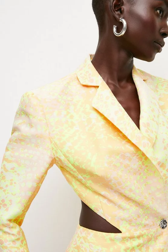 Edgy cut-outs and a sharply cut hemline make this statement animal jacquard blazer dress a truly contemporary addition to your after-dark wardrobe. An ultra-modern example of sharp tailoring, it frames the figure beautifully and fastens with a bold crystal button. Spin around to show off the dramatic back cut-out trimmed with a sporty D-ring clasp.