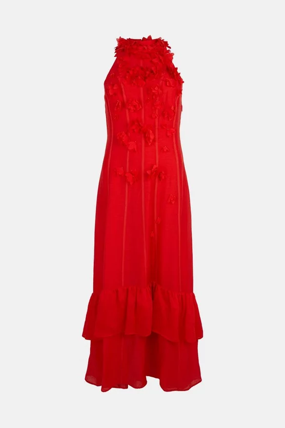 A beautiful combination of applique flowers and antique-style beading lends this show-stopping maxi dress a head-turning flourish. Featuring a feminine halter neckline and open back, this tiered design is perfect for balmy soirees and sun-drenched adventures.