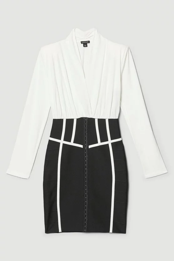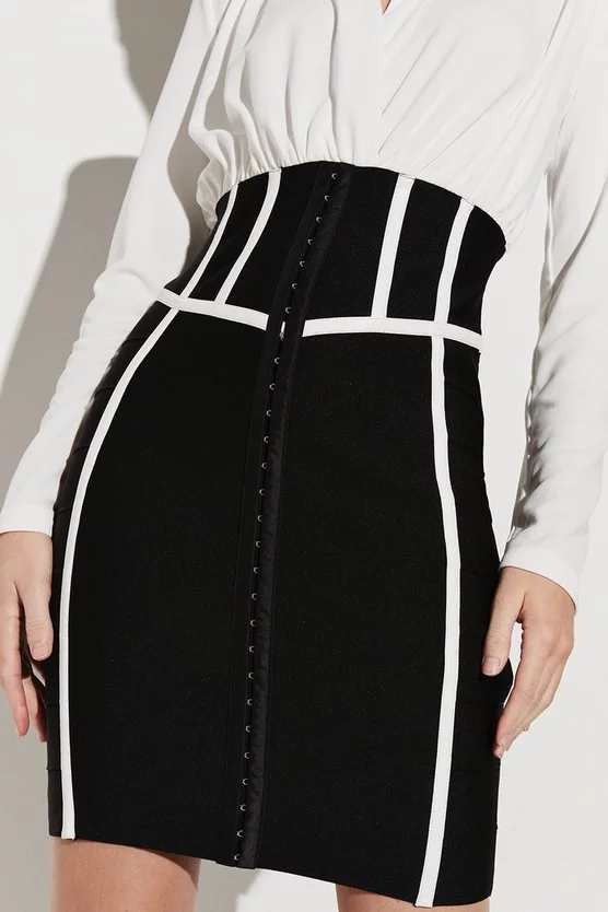 This contemporary dress combines sensual allure with sophisticated monochrome palette. A corset waistband and shapely panelling create a contouring effect which cinches the silhouette, while slinky material drapes elegantly across the bodice.