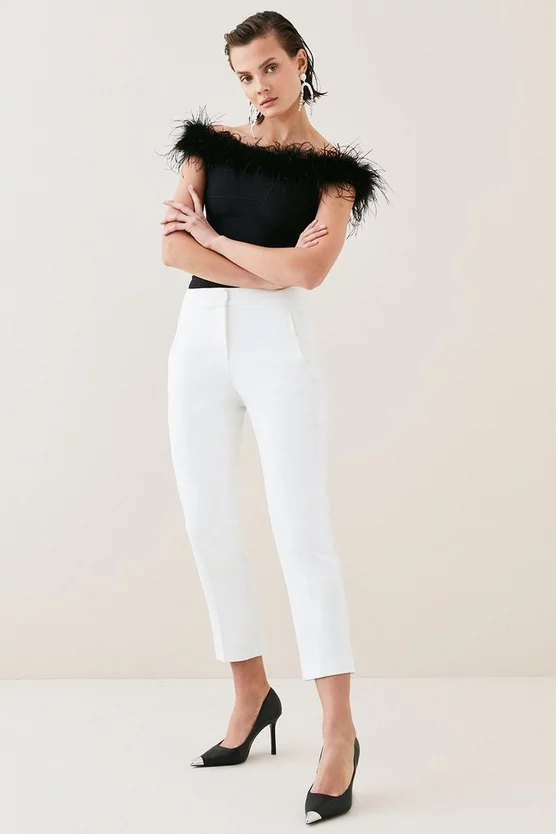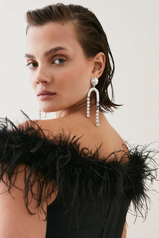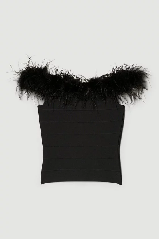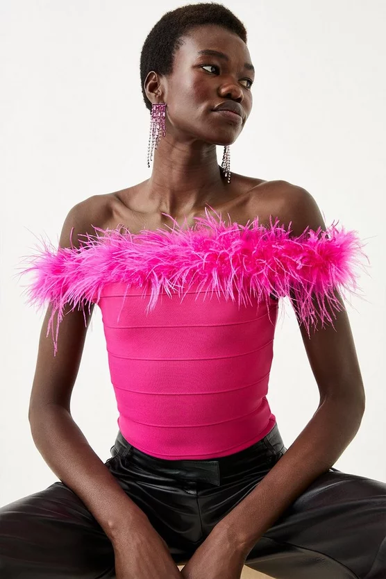 Playful proportions define this after-dark piece. With a tactile feather trim and contouring bandage composition, it defines the silhouette with second-skin aplomb.