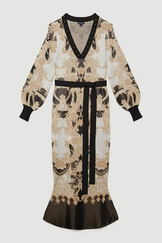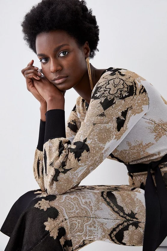 82% Recycled Viscose, 18% Metallised Fibre. Wash with similar colours. Model wears UK Small. Small centre back length approx 140cm.