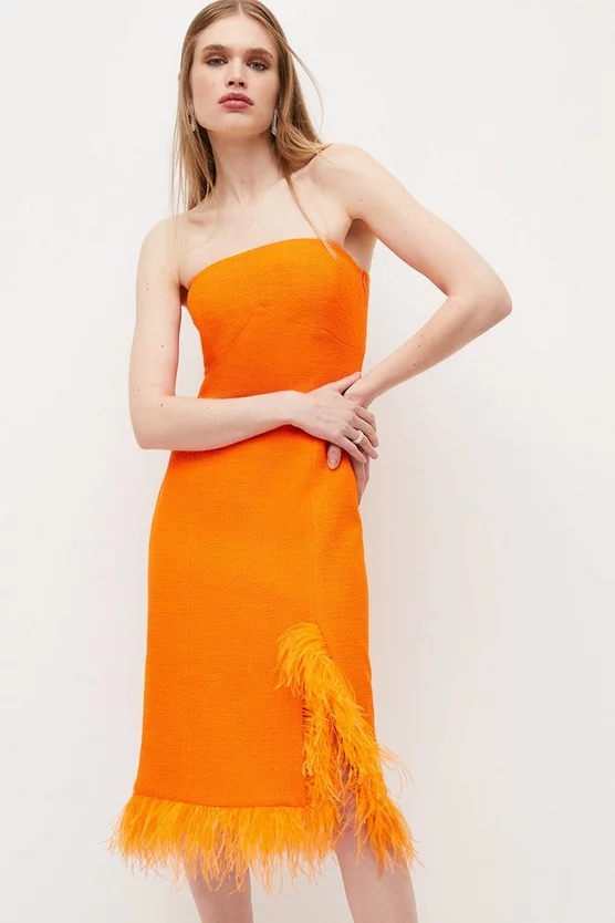 A lesson in summer opulence, our dramatic bandeau dress comes emboldened with a flamboyant spray of feathers at the hem. Crafted from premium boucle fabric for a softly structured fit, this head-turning piece was made for those who love to stand out. Show off the bold sunset hue with matching satin platforms.