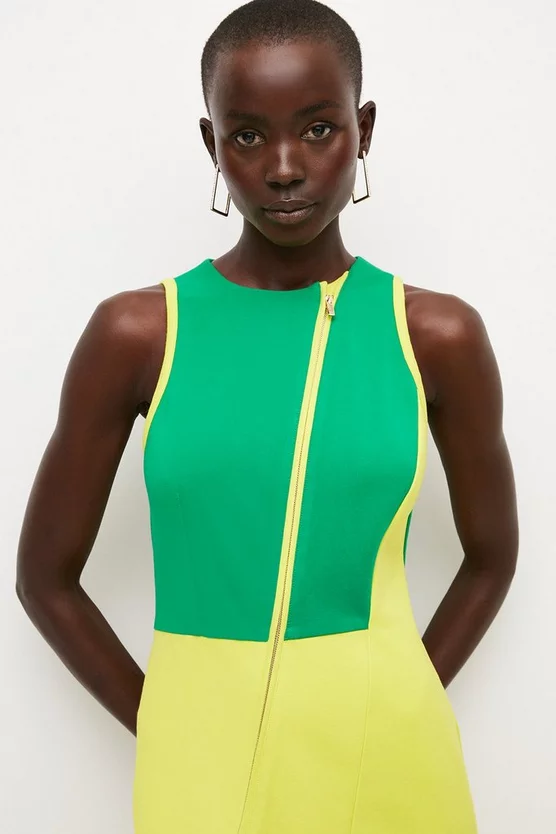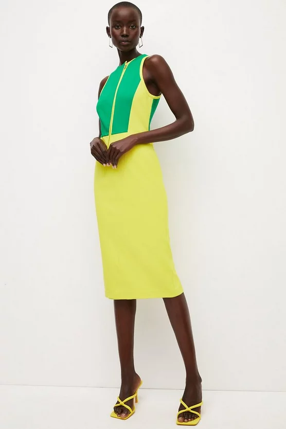 Refresh a tired dress selection with a zingy pop of colour this spring. Detailed with fresh colour-blocked panels and a sporty zip, this sleeveless midi dress is sure to catch the eye. Softly structured ponte fabric lends a shapely, scuba-style vibe to this ultra-modern piece.