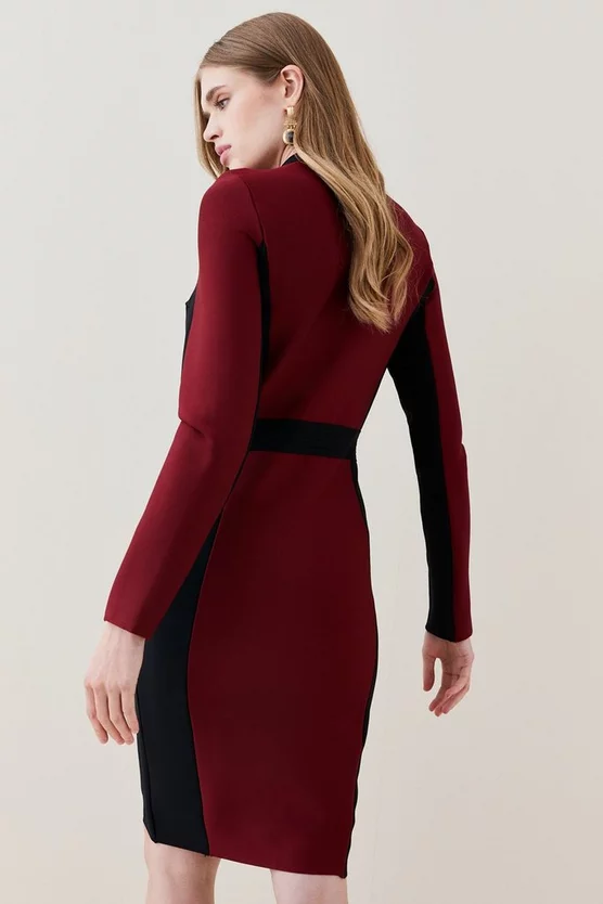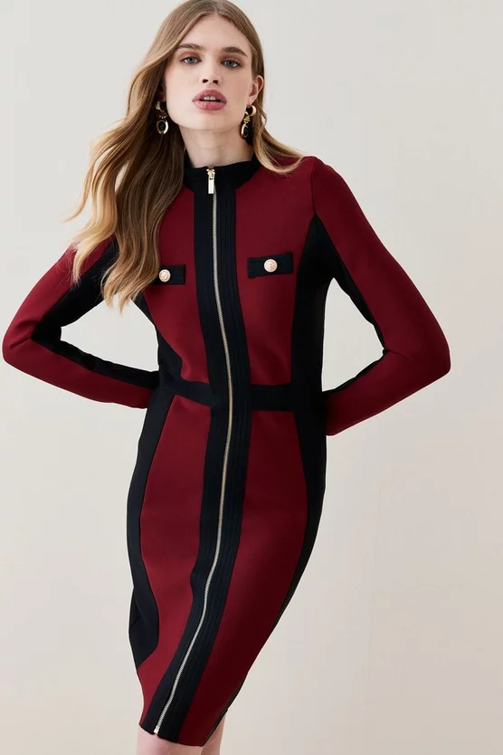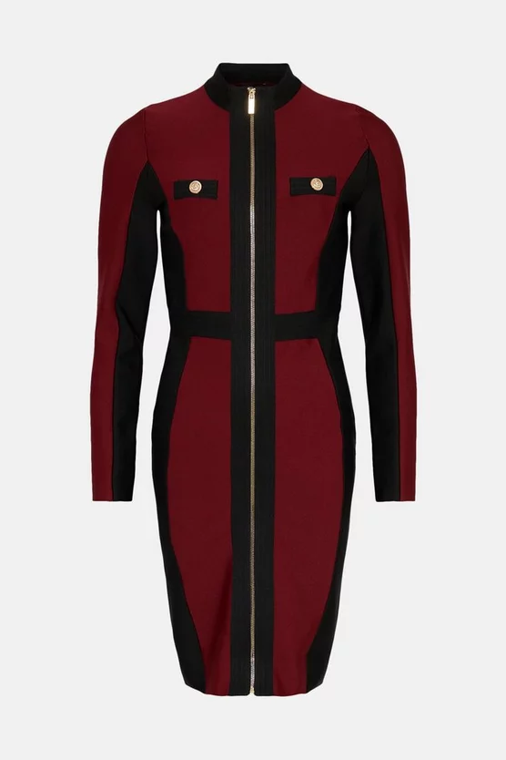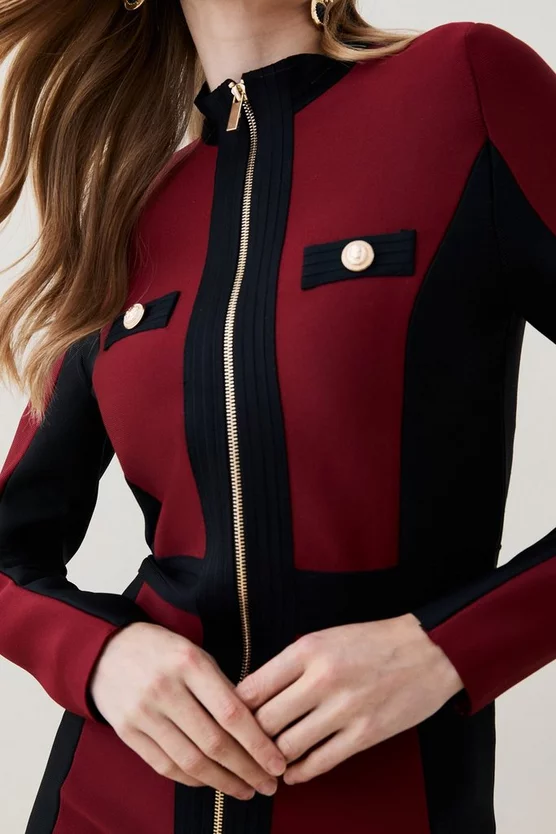 Influenced by racer styles, this mini dress merges luxe athleisure with the allure of a form-fitting bandage composition. Contouring the silhouette with a high neck and pencil skirt, it has a full zip that can be styled as a V-neck and split hem. Boasting contemporary colour blocking, it has engraved gold buttons to the faux chest pockets.