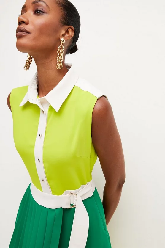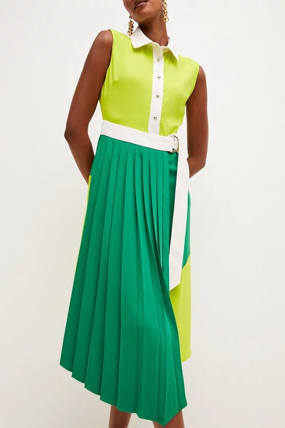 A style that would fit right in on the side lines of Centre Court, this softly pleated design combines cool colour-block panels with a preppy collar, buttons and a D-ring waist tie. Sharply pressed pleats adorn one side, swishing down into an asymmetric hem that moves beautifully as you stride through summer.