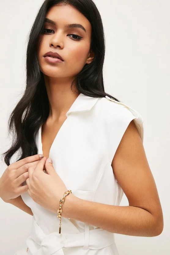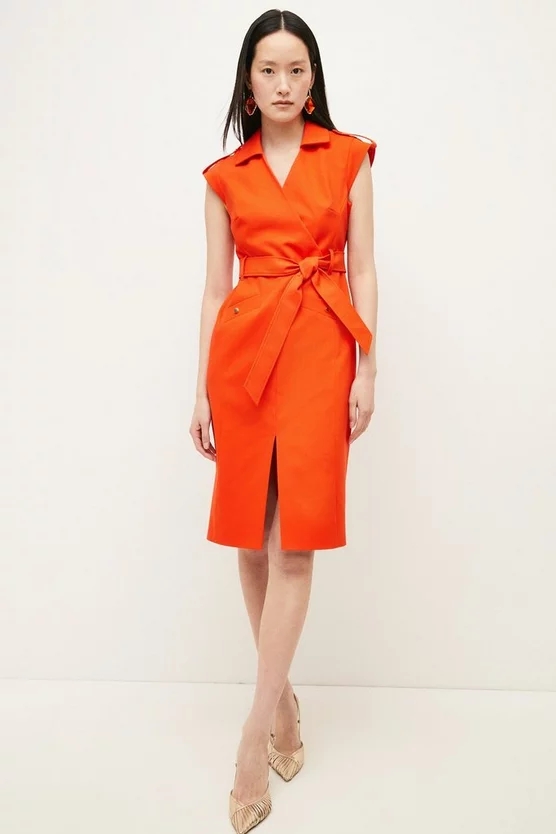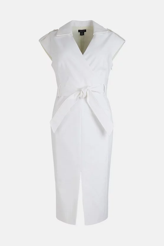 Subtly showing off curves with its pencil silhouette and waist-defining belt, this military-style cotton-blend dress was made for those desk-to-dinner days. It features understated details like belted shoulders, slip-style pockets and a sharply cut hem split to refine the classic silhouette.