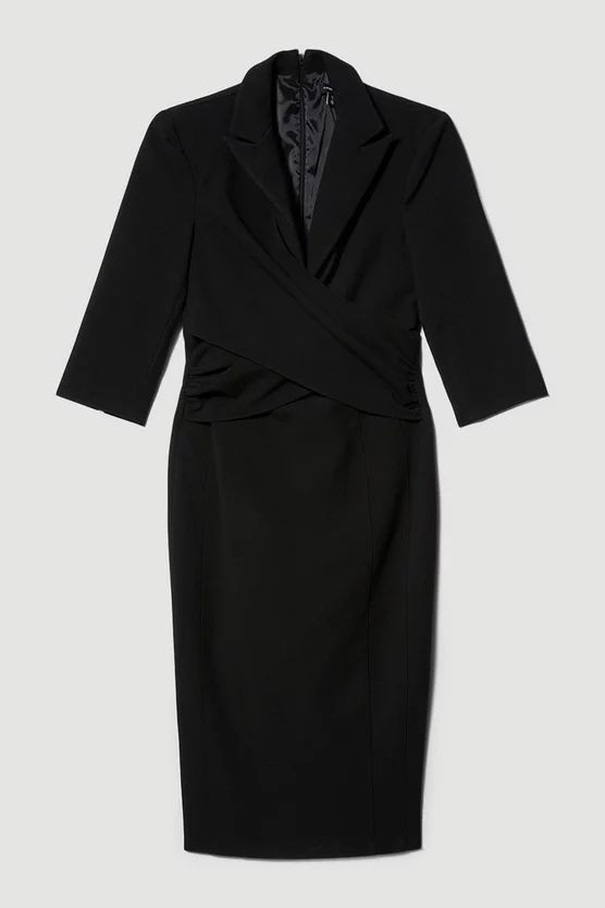 Contemporary yet classic, this refined midi dress is a true investment piece with style longevity. Crafted with a KM signature cloth and cut, its versatility will outfit a breadth of events for years to come. A pencil skirt design sculpts the silhouette, further emphasised by a wrap effect at the waist, while notched lapels add an elegant touch.