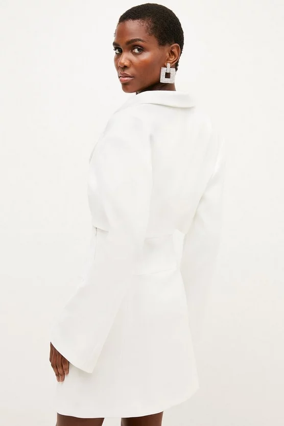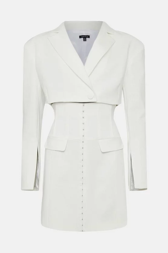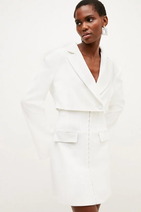 Made for modern minimalists, this statement blazer dress shows off a cropped, boxy top half complete with contemporary split cuffs. Contrasting with the voluminous sleeves, our designers have created a corset-style skirt that gently sculpts curves, lined with delicate hook-and-eye closures. A truly directional design, offset the fresh ivory tone with chunky black heels and gleaming gold jewelry.