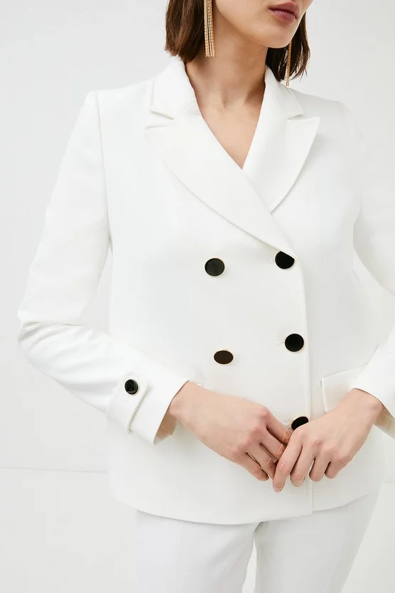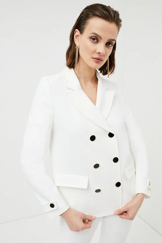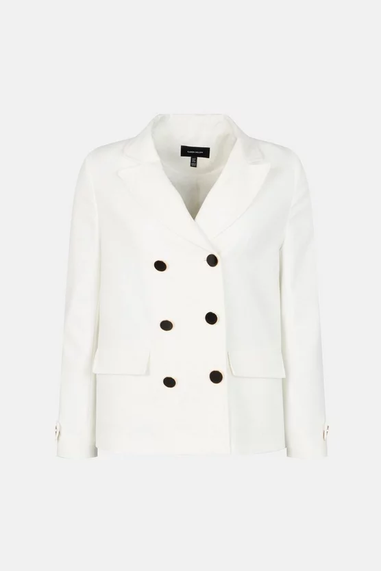 With its boxy silhouette and contrasting double-breasted buttons, this softly tailored jacket will be the new star of your cover-up collection. Crafted from our signature Compact Stretch fabric, it promises day-long comfort and always keeps its shape. Flap pockets and notched lapels ensure a classic finish.