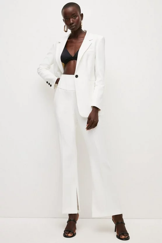 Summer suiting at its finest. These versatile high-waisted trousers come spun from our signature Compact Stretch fabric for day-long comfort with a hint of stretch, and show off a thick waistband and edgy hem splits. The subtly flared shape feels effortlessly on-trend for SS22 and pairs perfectly with a sharply tailored jacket or gauzy blouse for work.