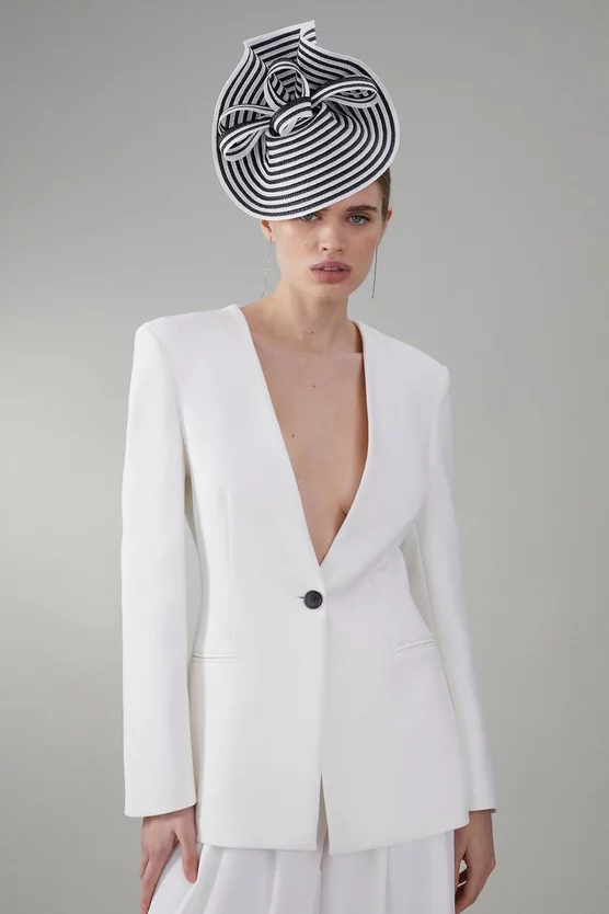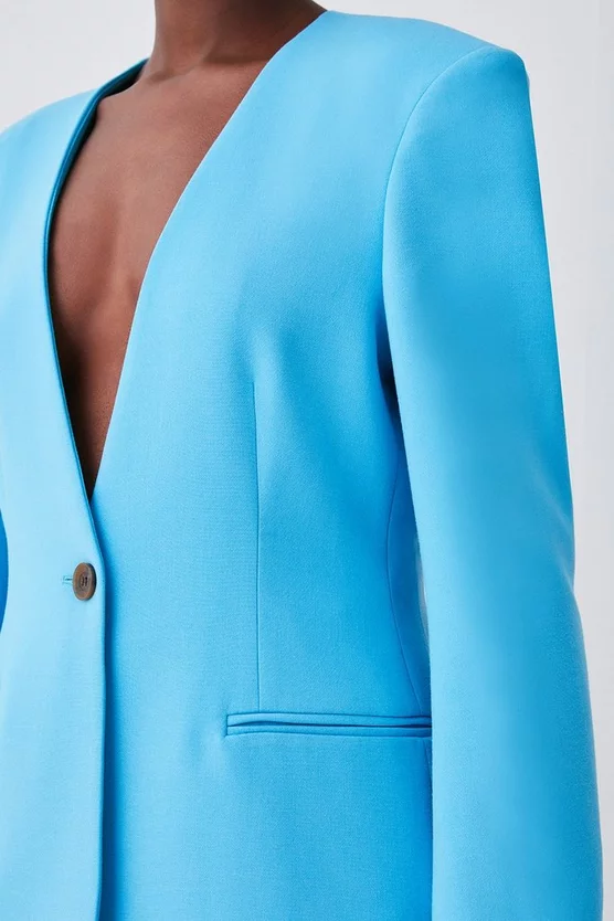 Championing minimalism and sleek tailoring, this blazer makes a worthy addition to your capsule wardrobe, as well as occasionwear rotation. The single-breasted, collarless design creates a streamlined silhouette, while in-seam pockets and a sharp, plunging neckline add a refined touch.