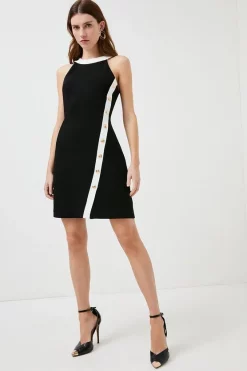In a fitted A-line design, this compact stretch dress exudes comfort and style in a powerful combination. With a rounded high neck detail, the sleeveless design effortlessly skims the silhouette, enhancing the waist. With a hidden zip at the back, theres a nod to the nautical with gold metallic buttons on the front as a considered extra.