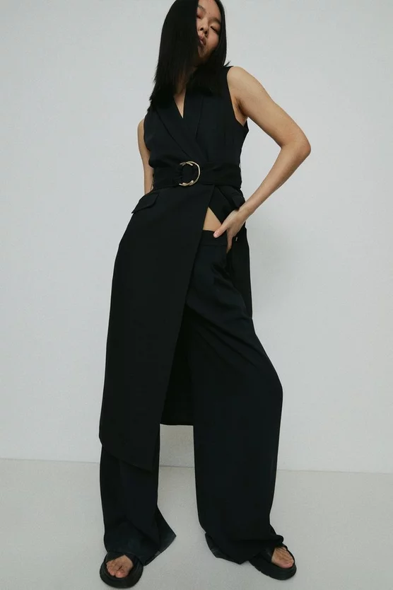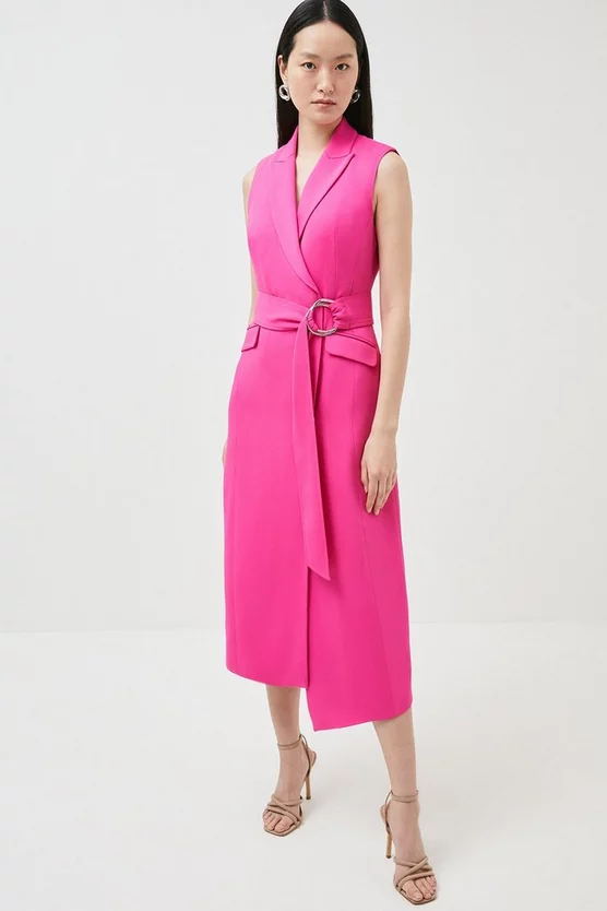 Enter a bold new era of modern power dressing, starting with this sleek sleeveless tux dress. With its androgynous design details ? think sharp lapels, a sporty ring belt and flap pockets ? this alluring asymmetric design strikes a seriously sophisticated style note, in the boardroom and beyond.