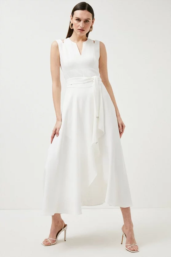 Made from our signature compact stretch fabric, this dress is soft to the touch and has four-way stretch so it always fits like a glove โ perfect for all-day wear. Designed with cut-out panels, carefully placed seams and a knotted back, the bodice beautifully emphasises your frame. Pulled together by a self-tie belt thatโs detailed with luxe stitching and metalwork trims, the piece flows into a ruffled wrap-over skirt that gracefully grazes the ankles.