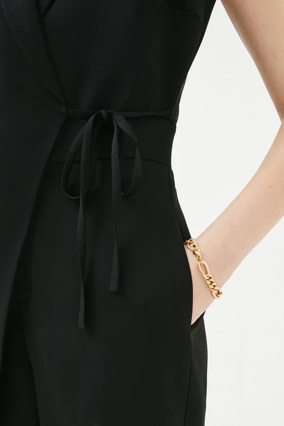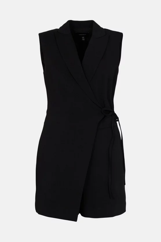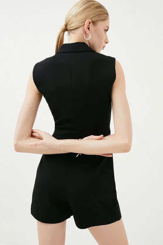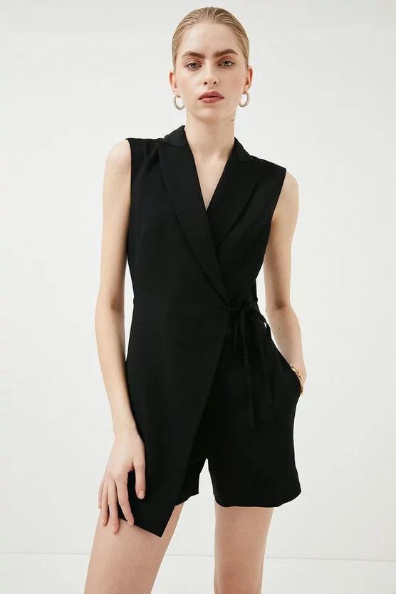 Tailored with a contemporary twist, power dressing is reimagined for this sleeveless tuxedo playsuit. Composed from Compact Stretch for a contouring, close fit that boasts four-way stretch, the silhouette nips in the waist with a self-tie belt. It has structured characteristics including notched lapels and fitted shorts with a draped overlay. Pair with stilettos and a bold red lip for statement-making office styling.