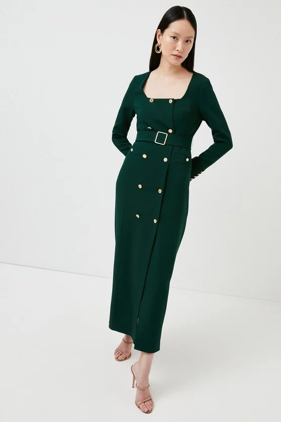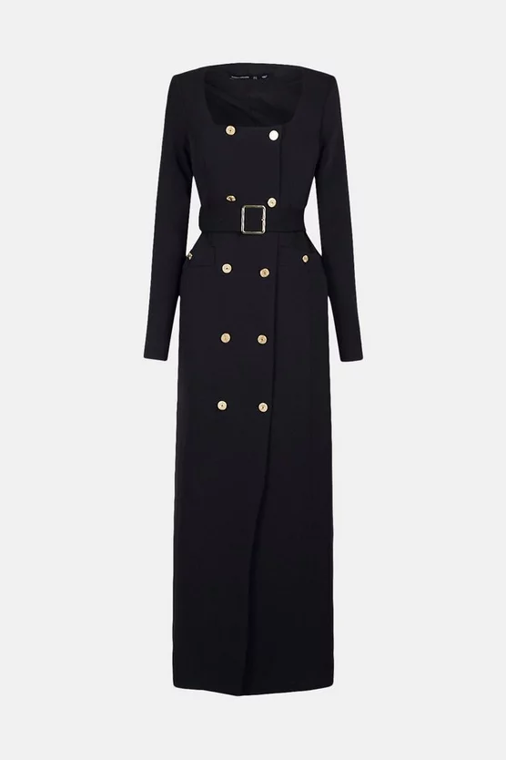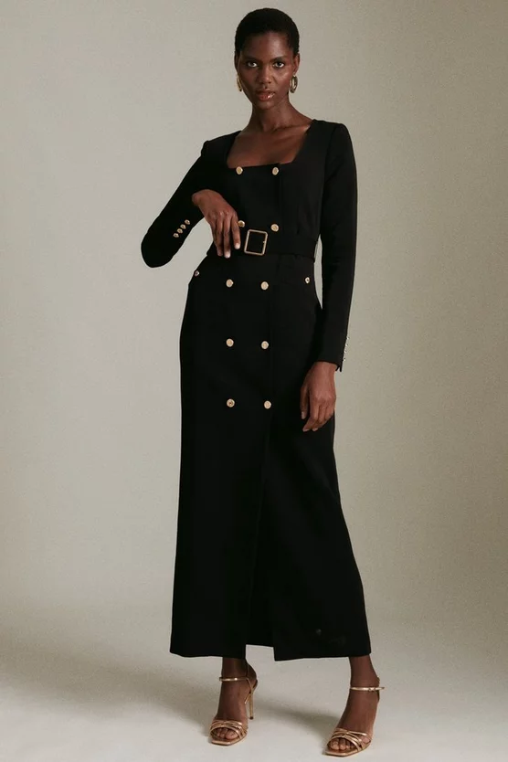 Merge timeless tailoring with contemporary femininity for your next big event. A floor-length piece thatβs composed from Compact Stretch for a contouring finish, this maxi dress is defined by a square neckline and split hem. It has rows of engraved gold buttons to the double-breasted front and cuffs, and is defined by a waist-cinching belt.