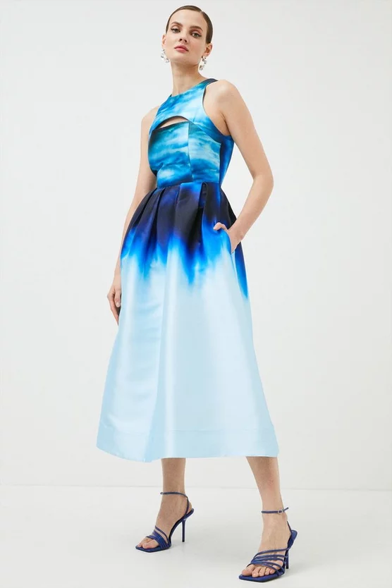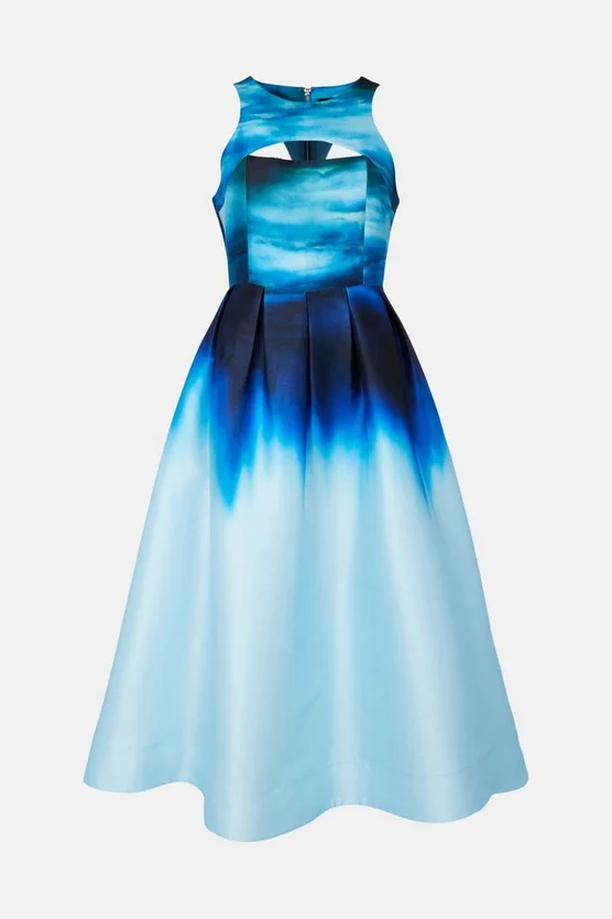This printed prom dress is part of the Karen Millen x Nicholas Hughes collaboration. The exclusive, limited collection showcases photographer Nicholas hand printed imagery, metamorphosed into exclusive prints synergised by our in-house design team – this one inspired by his Aspects of Cosmological Indifference artwork.