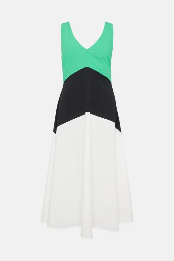 Taking the colour block trend into SS22, this pure cotton midi dress is a warm-weather must-have. It shows off blocks of colour that accentuate its simple shape, flared skirt and sophisticated crossover straps. Add a cloud-like clutch and gleaming gold extras to take it to wedding reception territory.