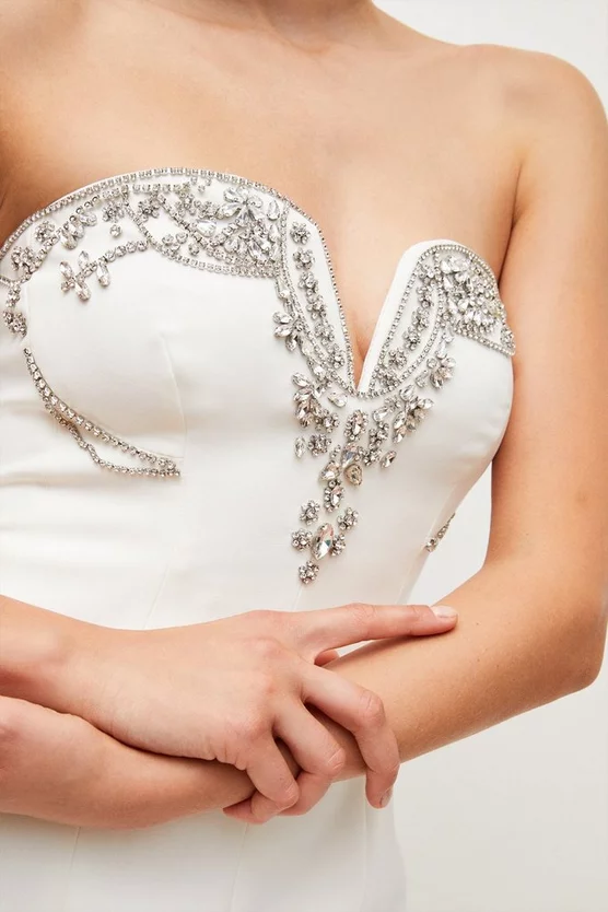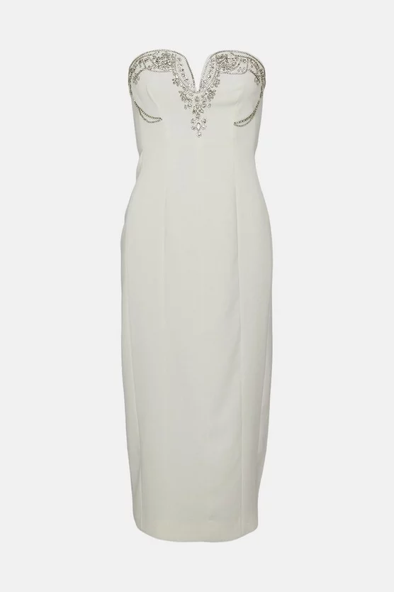 Designed to seductively sculpt the curves, this premium cady midi dress is sure to boost your confidence. Sparkling diamante crystals frame the plunging sweetheart corset, revealing polished shoulders to sultry effect. It zips at the back for easy wear, draping down to a demure mid-calf length accented with a subtle hem split.