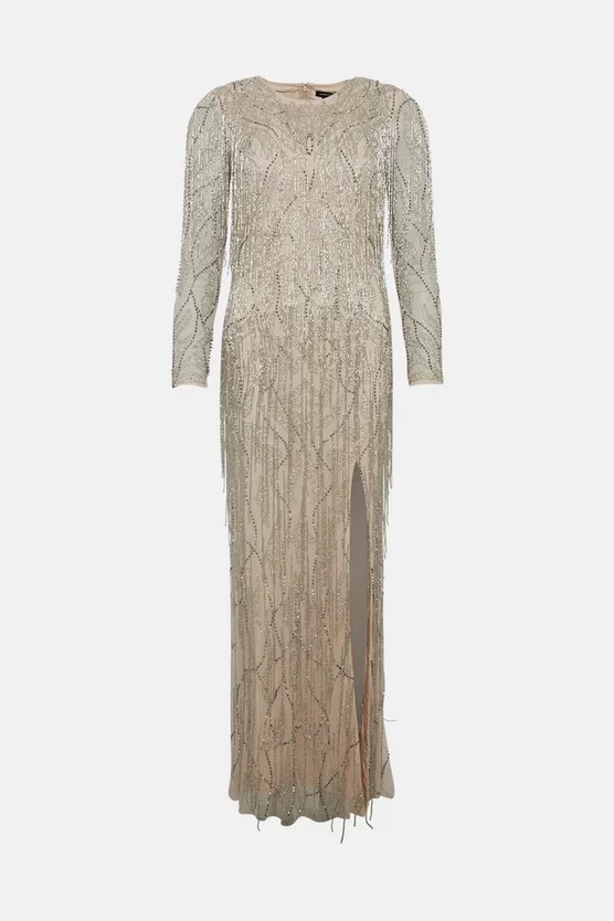 A style that sparkles beautifully beneath the moonlight, this Art Deco-inspired maxi dress glimmers with beaded tassels and opulent embellishments. Our designers have added a high neckline and sleek, semi-sheer sleeves to modernise the glamorous details, and finished the look with a leg-baring split hemline and gauzy, semi-sheer overlay.