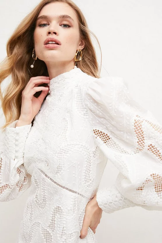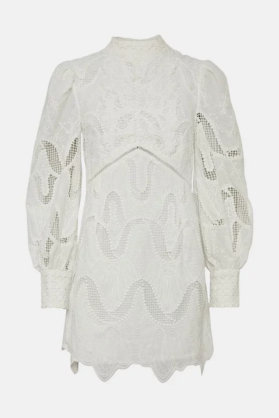 Nodding to the opulence of another era, this sumptuously crafted white mini dress comes detailed with fine cutwork, lace, and scalloped trims. Accentuate its softly puffed sleeves, artisanal details and delicately buttoned cuffs with strappy heels for sunset cocktails, twirling around to show off the unexpected back cut-out.
