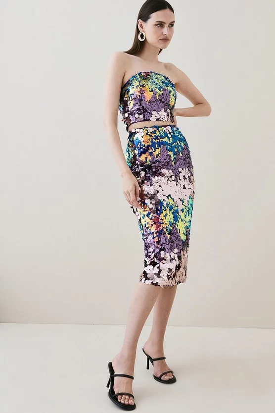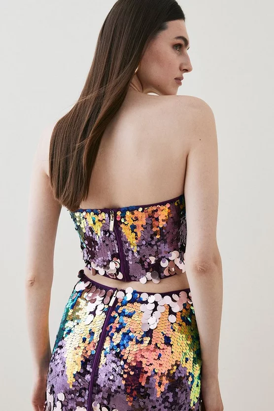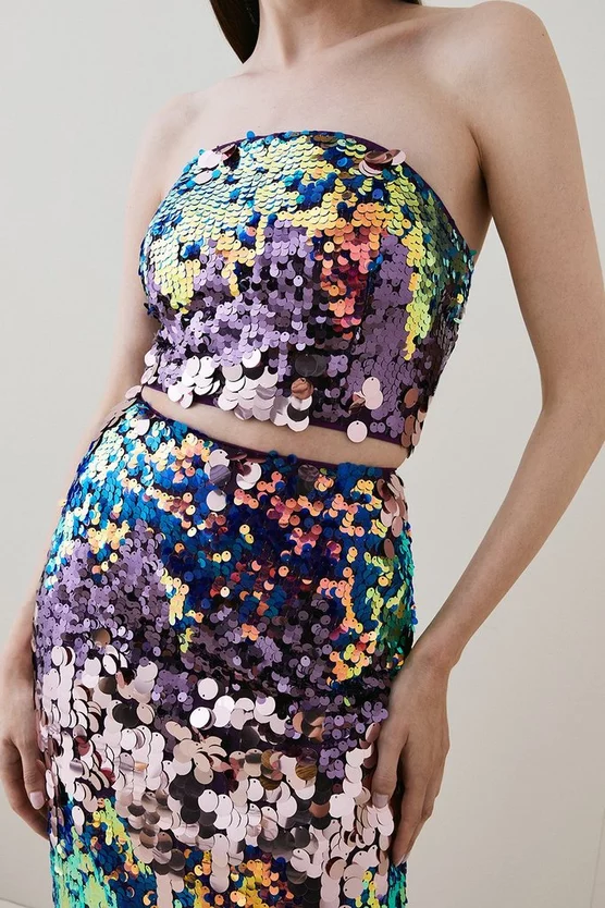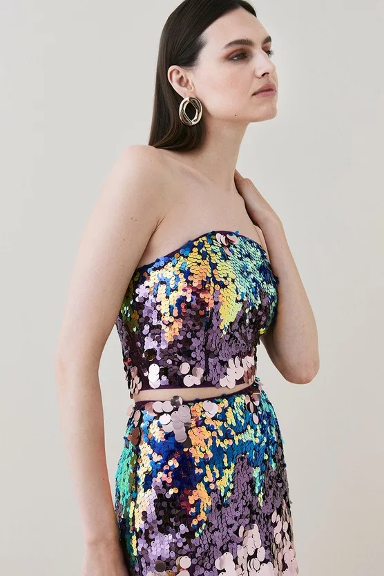 Make a statement in this eye-catching bandeau top. Each ray of light reflects off the sequin embellishments, creating an enthralling mirage. Style with a statement necklace and coordinating skirt for a sensational evening look.