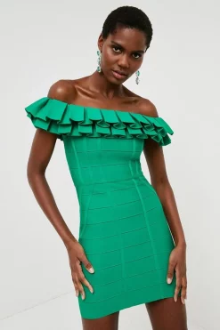 Be the talk of the party in this show-stopping bandage dress. Cut from finely knit panels that sculpt curves to perfection, it makes a bold and flattering choice and features a look-at-me layer of frills bordering the flirty Bardot neckline.