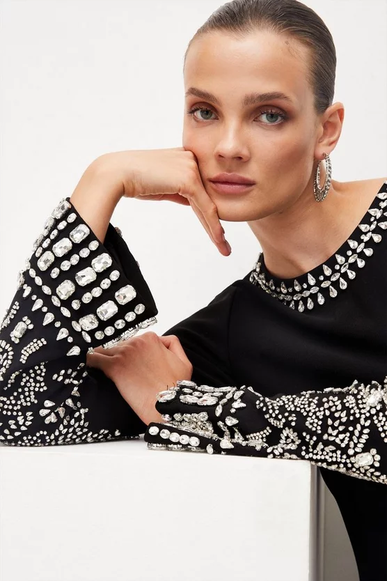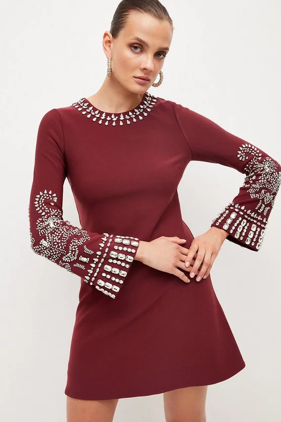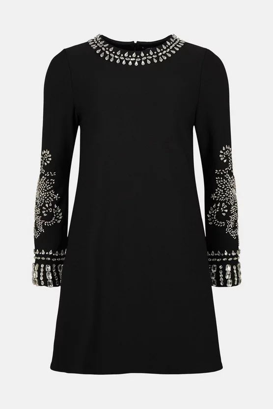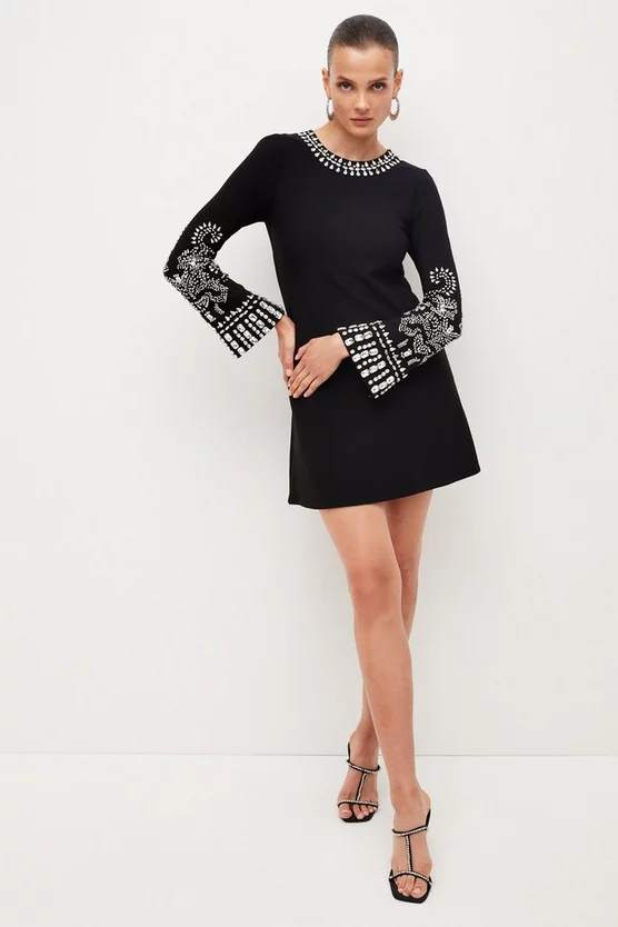 Turn heads in this elegantly embellished mini dress. Combining a swinging sixties-style silhouette with crystal detailing and gently flared sleeves, itβs the perfect plus-one to every party in your calendar.