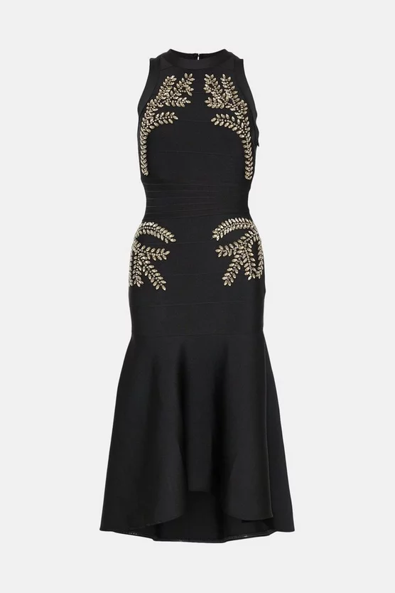 Our designers have dreamt up a beautiful choice for formal gatherings in the form of this elegant bandage dress. Detailed with sparkling leaf-shaped embellishments and a flared, asymmetric skirt, its sure to stand out from the crowd. Spin around to show off the modern back cut-out and figure-sculpting fit.