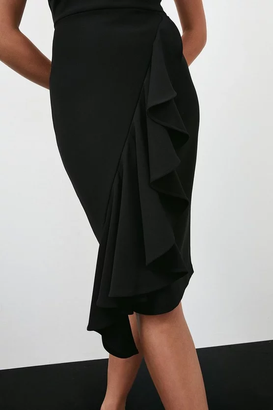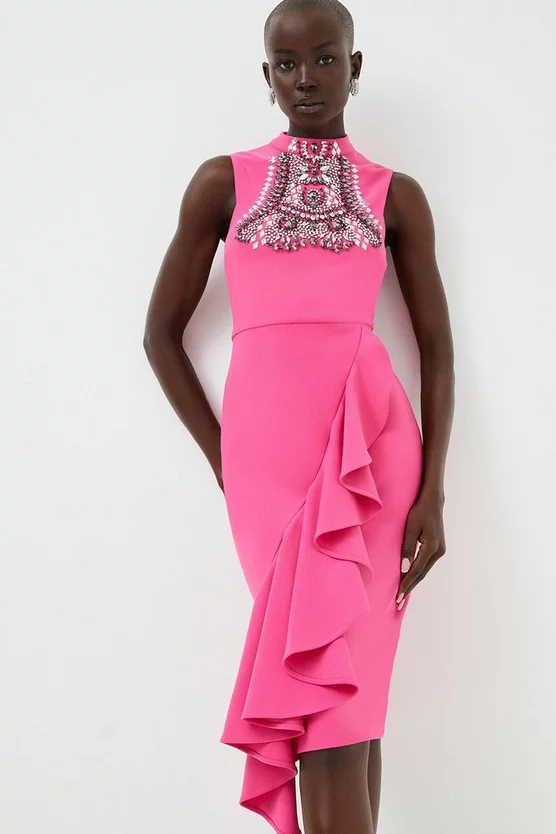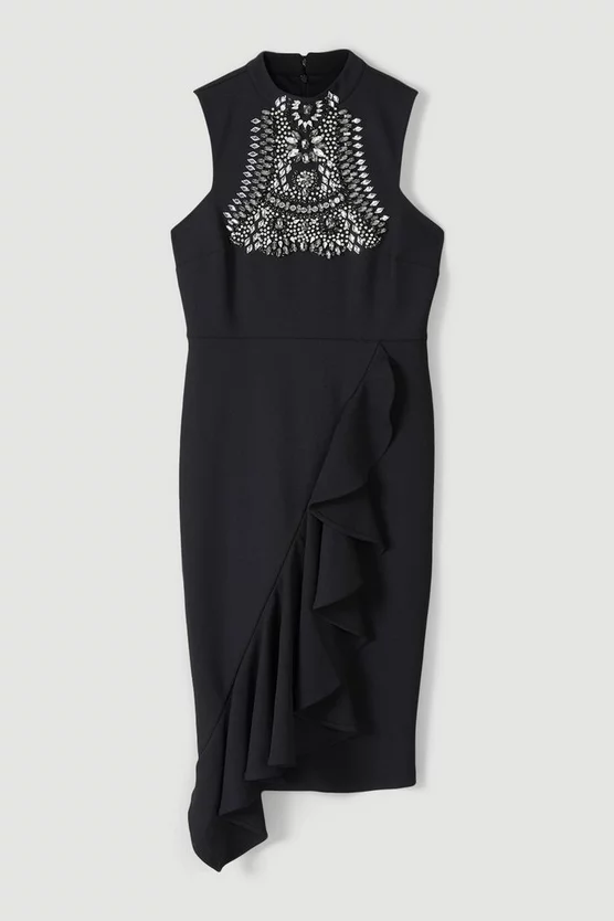 Intricately detailed with an essence of opulence, this midi dress combines timeless tailoring with runway-inspired elevation. Crafted from Figure Form crepe for a contouring effect, the high neckline of this piece is studded with an intricate crystal formation that catches the eye. It lands at a ruffled skirt for extra dimension โ a form that perfectly pairs with barely-there heels for a balanced effect.