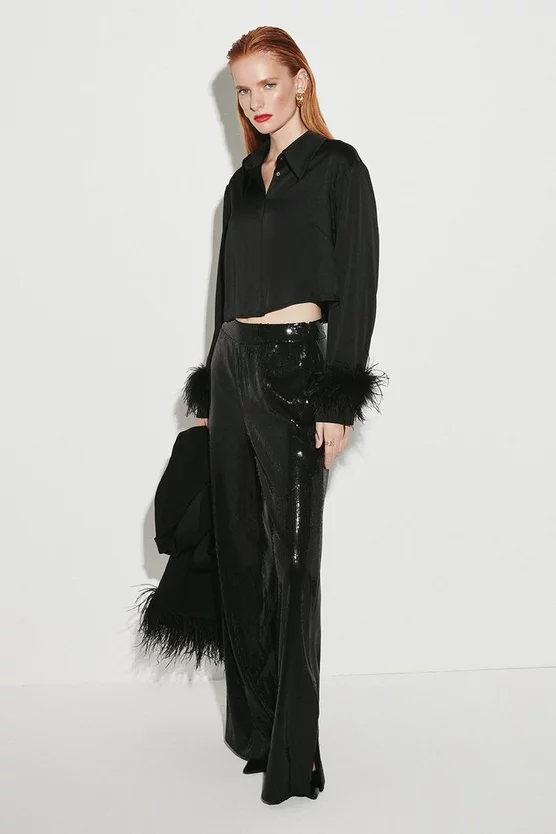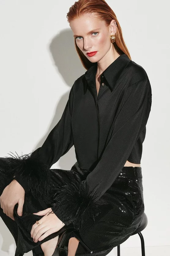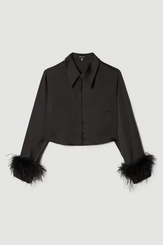 A covetable piece with timeless appeal, this satin shirt features feather-detailed cuffs and exudes a understated elegance. A cropped fit allows this piece to be styled multiple ways, pair with pointed heels and black sequin trousers for a party-ready aesthetic.
