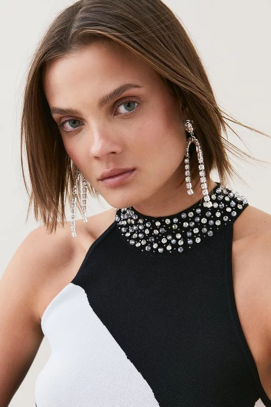 A party-ready piece with a retro feel, this mini dress was made to be seen. The dress features a subtle swirl pattern in classic monochrome, elevated by a diamante-embellished halter neckline. The hemline is adorned with vivacious plumes of feathers which match the black and white colour scheme of the dress, creating the perfect balance between fun and sophisticated.