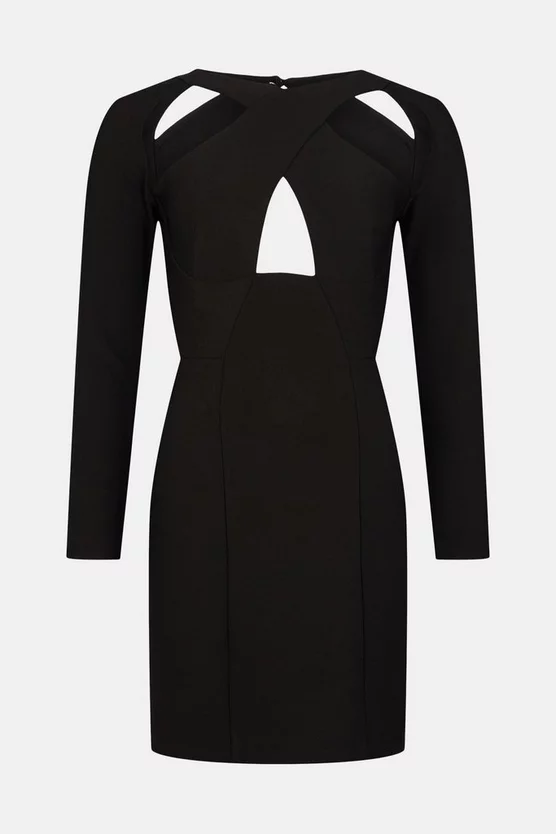 A bold new take on the LBD, this sultry reveal-and-conceal style hugs the figure in all the right places and features head-turning cut-outs and a crossover neckline. Dare to bare polished skin courtesy of the seductive open back, which comes trimmed with a sporty exposed zip.