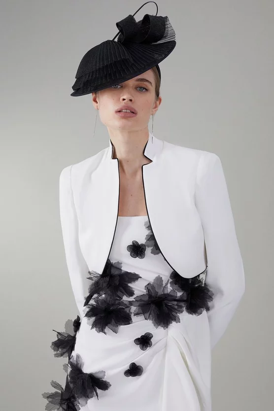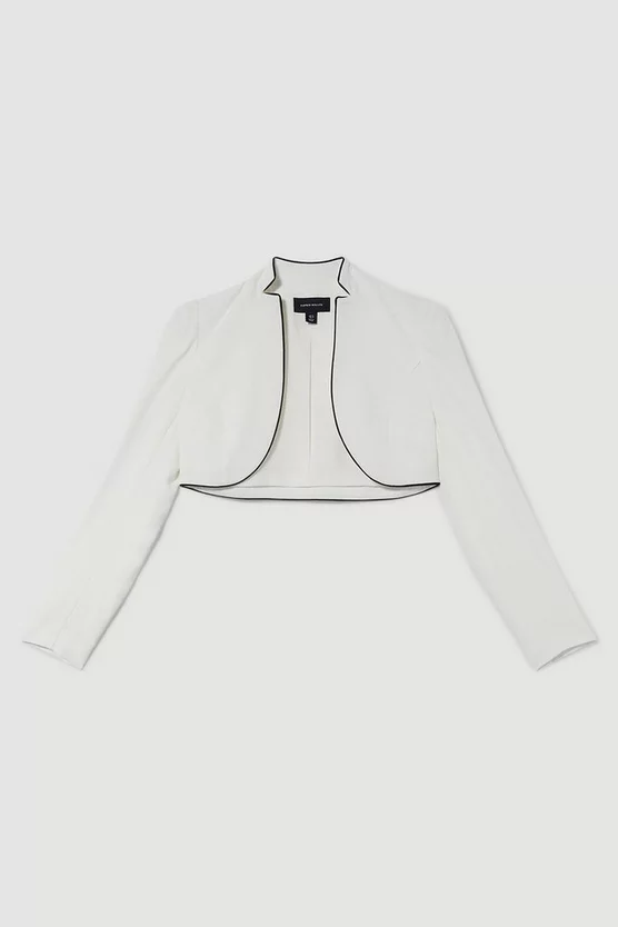 Cut in an elegant, curved shape, this cropped jacket provides a refined addition to occasionwear dressing. Featuring a classic monochrome palette, this piece can be paired with a dress or tailored ensemble with ease.
