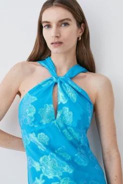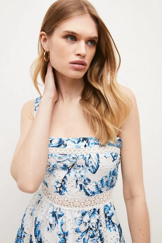 A thoroughly romantic choice for your next summer get-together, this organic cotton mini dress combines delicate Guipure lace trims with elegant tiers and a classic square neckline. Detailed with a vintage-style duck egg-blue print, this floral design makes a fanciful addition to any summer dress collection.