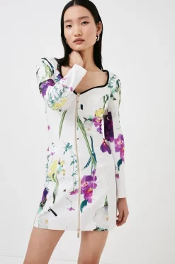 Breathe fresh life into your wardrobe with this beautifully feminine floral dress. In a bodycon style it effortlessly skims the silhouette, complimented by its sweetheart neckline. Showcasing an exposed zip across the centre as a modern touch, the contrast piping adds edge to this flowery design.