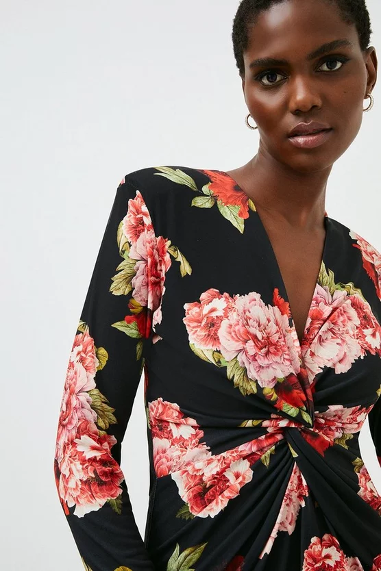 A seductive take on spring florals, this printed mini dress boasts oversized blooms and a unique twist-front detail for added textural appeal. Showing off a V-neckline, long sleeves and flirty above-knee hem, this versatile jersey design is the perfect pick for balmy spring get-togethers.