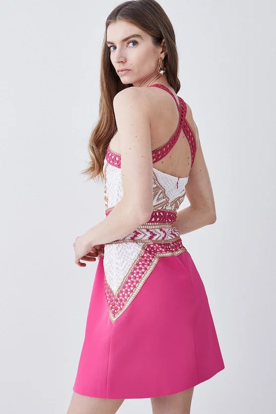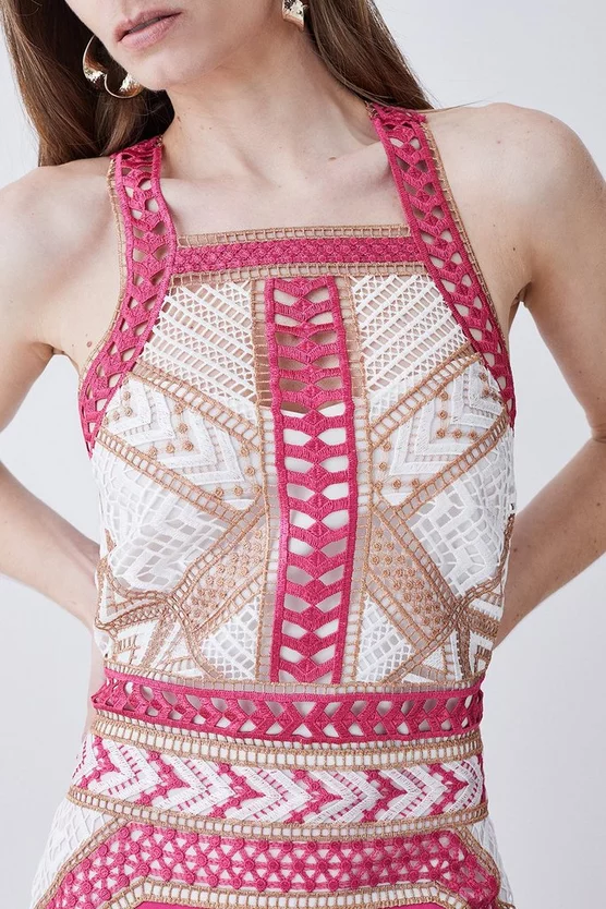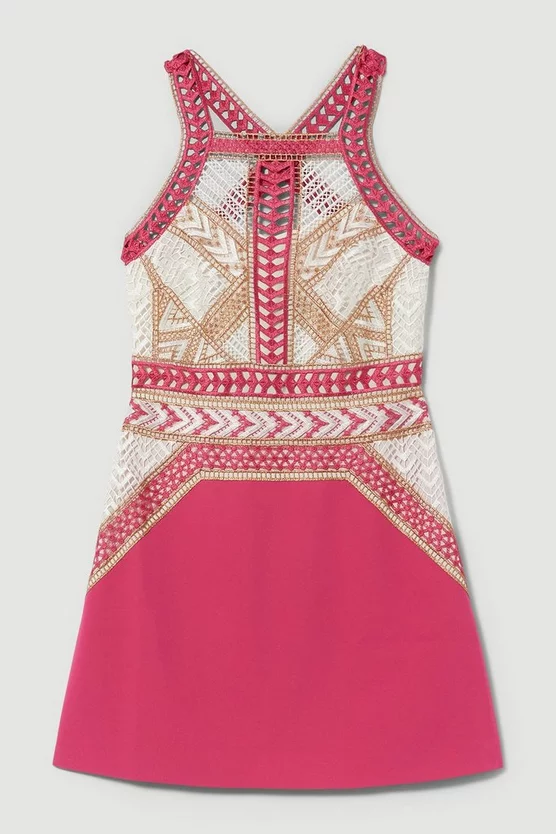 Deals ⌛ Karen Millen Geo Guipure Metallic Lace Woven Mini 👗 Dress – pink 🥰