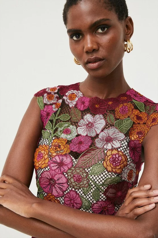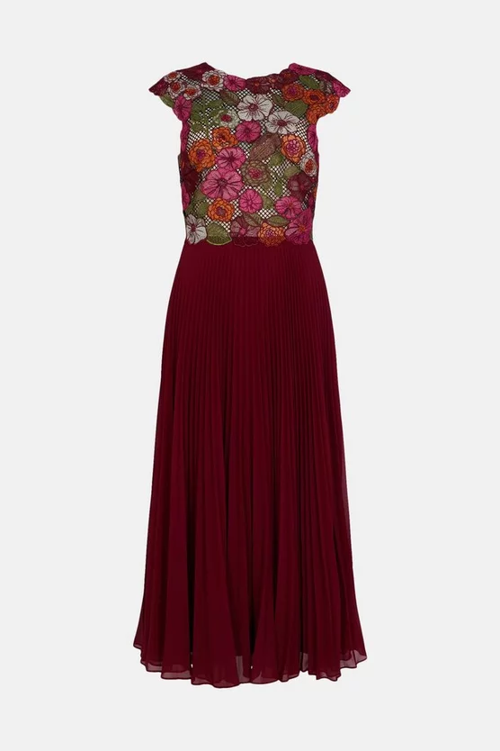 Creating the illusion of a skirt and top, this Guipure Lace midi dress is a welcome addition to occasion dressing, showcasing simplistic elegance and refined polish – a true summer statement. With a swishing pleated midi skirt and embroidered floral top, formulated as one, it boasts cap sleeve on the shoulders as a flattering finesse.