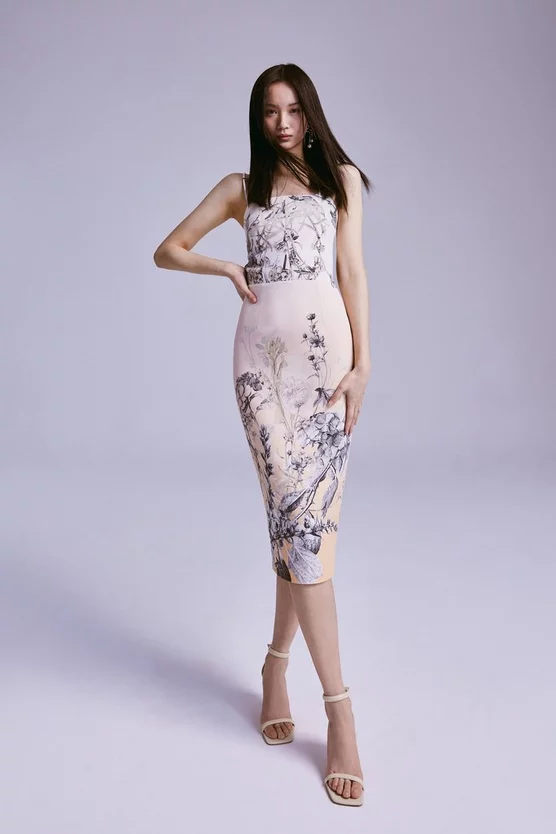 Hugging curves in all the right places, this ultra-feminine pencil dress is a match made in heaven for hourglass figures. It shows off an ethereal hydrangea print for an exceptionally detailed finish along with a pencil skirt and strappy bodice. Metallic bars adorn the double straps, offsetting a sporty back zip closure and alluring cut-out. Made for the romantic, hazy days of summer, it adds a sense of modern romance to balmy weddings or sunset cocktails.
