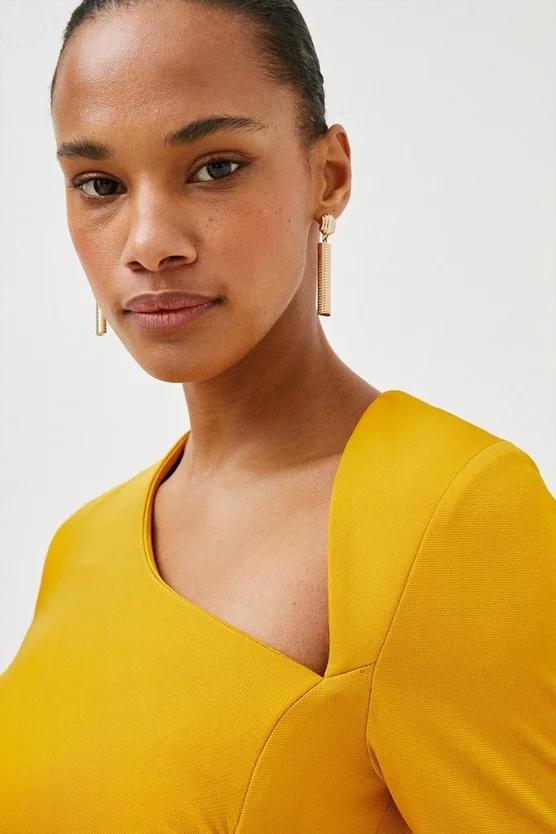 No ordinary pencil dress, this dazzling design showcases a directional neck cut-out and ruched side detailing. Feminine appeal comes guaranteed thanks to its softly structured Italian jersey finish, seductive hem split and strong shoulders.