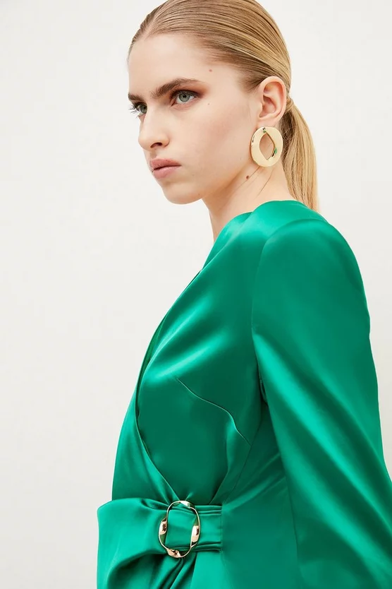 Get ready for your moment in the spotlight in this sophisticated dress. Marrying Italian structured satin with distinctive details โ think split-detail sleeves, wrap front and waist-defining buckle โ it strikes the perfect put-together style note for after dark.