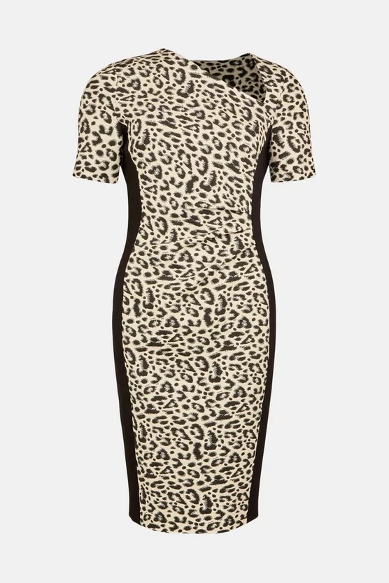 Sultry leopard spots and curve-defining ponte panels define this versatile work-to-weekend dress. Cut with an architectural slashed neckline, short sleeves and a demure midi silhouette, it adds a dash of glamour to any occasion.