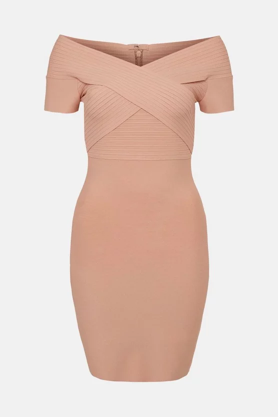 A lineup of summer events calls for an iconic bandage dress with off-the-shoulder bardot neckline. The short length bodycon shape is created in a firm technical knit and offers multiple styling options. Go for strappy heels and simple accessories in metalic colours for the evening, and for the daytime opt for popping colours.