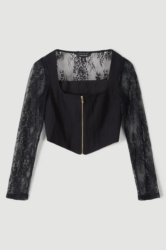 Contoured corsetry is reimaged with modern artistry for this sculpting piece. Defined by its industrial-inspired zip front, itβs contrasted with elegant blooming floral lace sleeves.