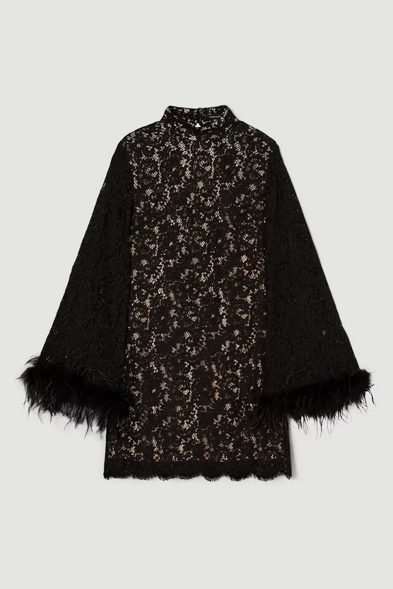Blooming with botanical embroidered mesh, this mini dress channels the majesty of the midnight hour with an intoxicating ensemble. From the feather-trimmed cuffs to the scalloped open back, pair this piece with towering platforms to offset the after-dark references.