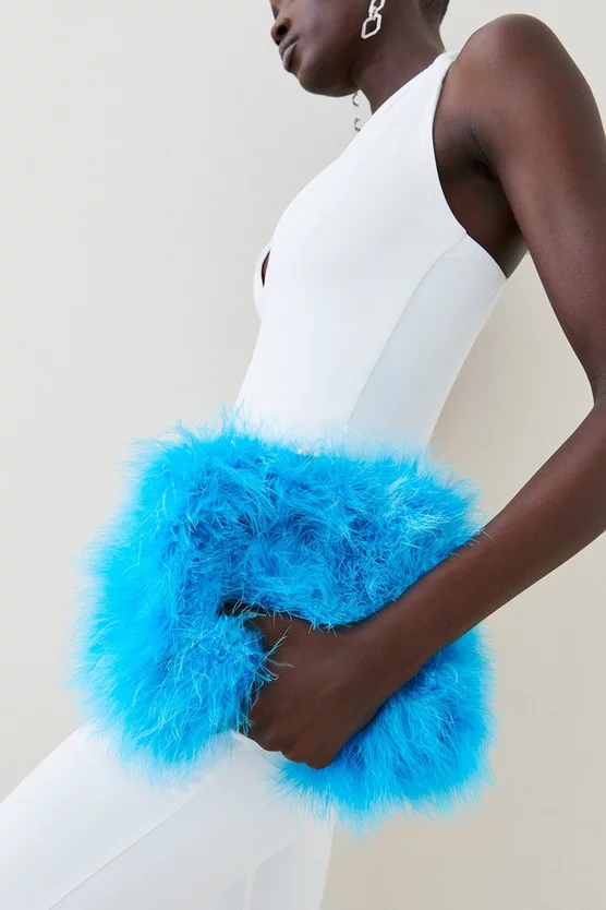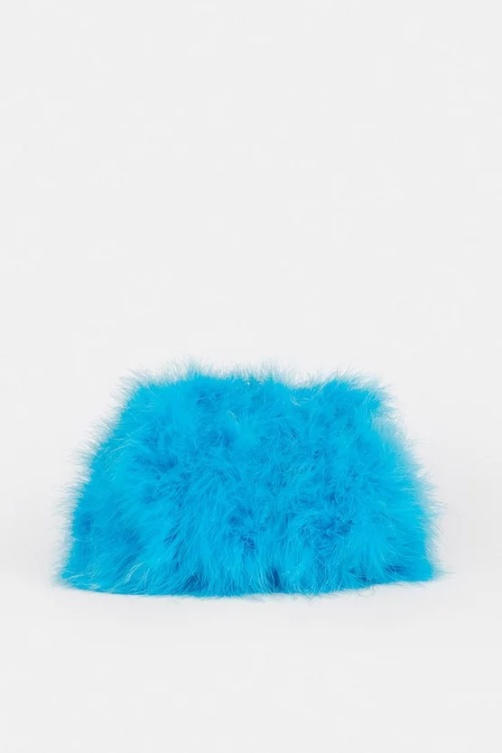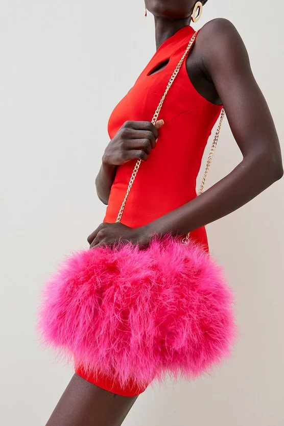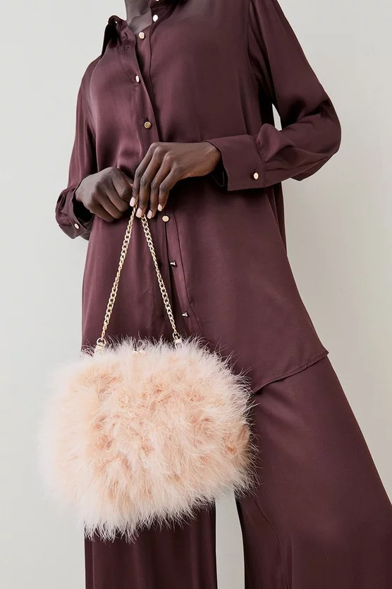 Playful tactility defines this fashion-first accessory. Appearing with a voluminous pouch silhouette, this feather bag suspends from a detachable chain shoulder strap for versatile styling.