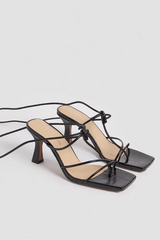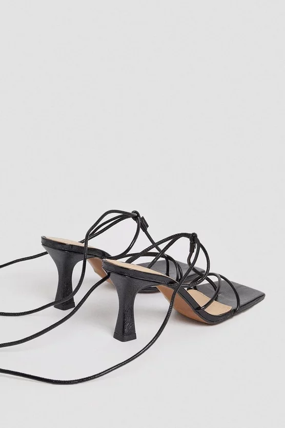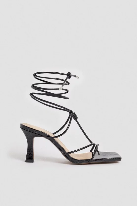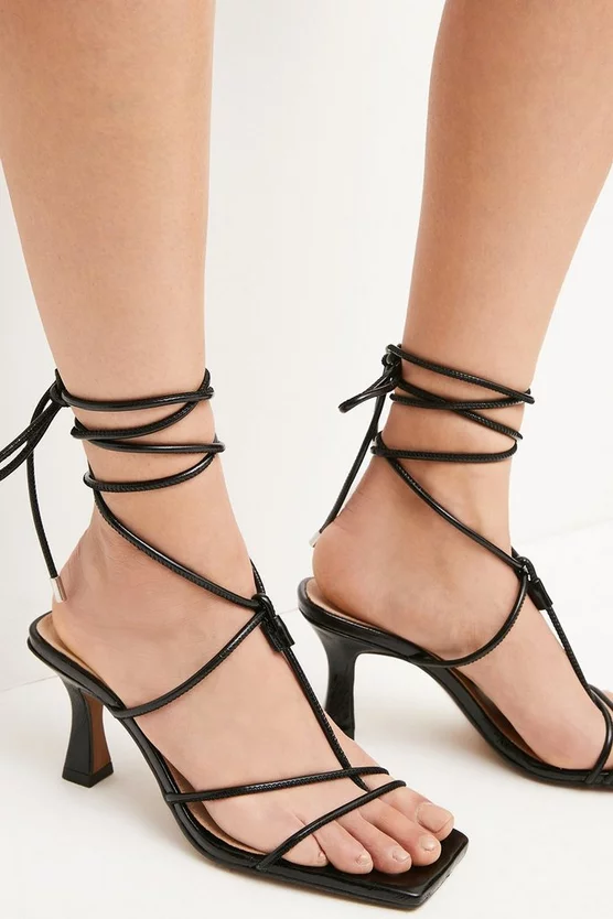 Indulge your eye for trends with the shoe of the season. Blending luxe leather straps that snake alluringly up the ankle with modern square toes and architectural heels, these standout strappy sandals were made to hit the dance floor, all night long.