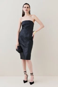 Capturing a refined aesthetic, this classic leather pencil dress is the perfect addition to your capsule wardrobe. A strapless bodice cinches the waist to create a sculptural silhouette, while a midi hemline keeps a modest mood.